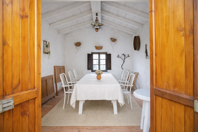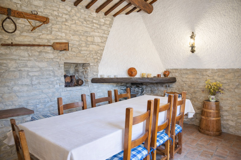 Secondo piano: comprende una luminosa sala da pranzo con camino originale in pietra, una cucina, due camere matrimoniali e un bagno.